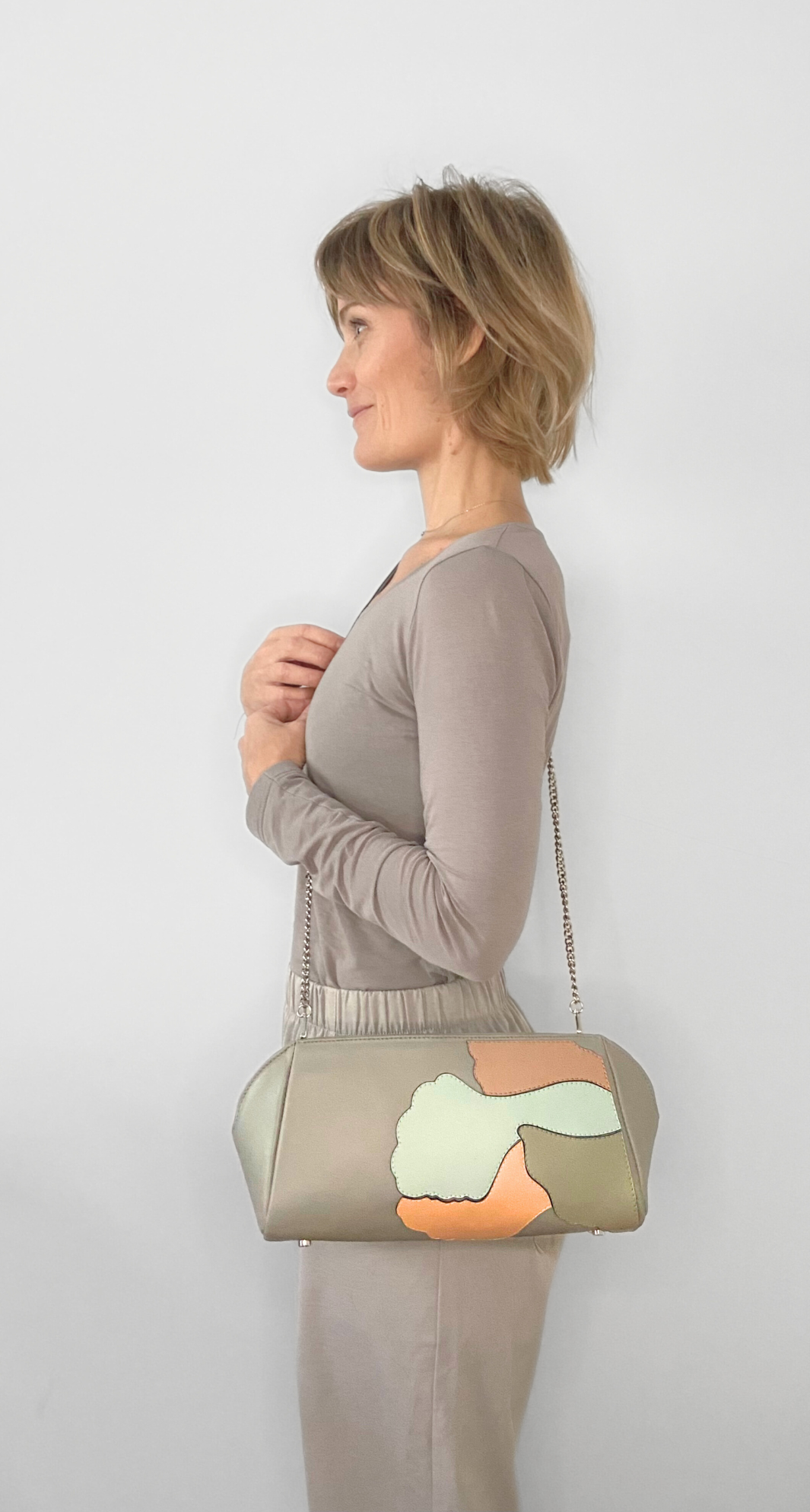 Kifinomult, kagylóformát idéző táska, karcsú vonalaival elegáns kiegészítő a mindennapokra és különleges alkalmakra. Lecsatolható, láncos pántjával kézitáskaként is viselhető – így több stílushoz illeszthető.